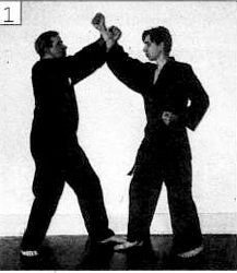 The Attacker punches to the face with the right hand.The Defender catches the punch with a High Crossed Wrist Block. The Defender pulls the Attacker’s wrist with his right hand while executing a left downward Backfist. The downward Backfist is a different way of entering the arm position described by a Middle Block. This sets up a Reverse Punch.